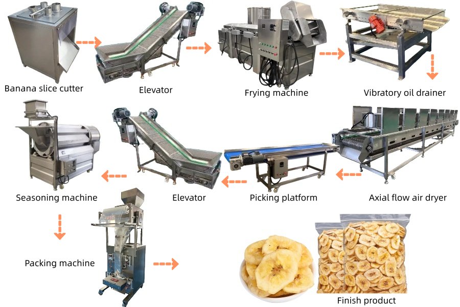 Peeled bananas → Slicing → Lifting conveyor → Fryer → Vibrating degreasing machine → Axial flow dryer → Sorting platform → Lifting conveyor → Seasoning machine → Quantitative packaging machine → Finished product