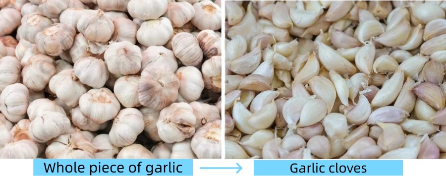Garlic clove separating machine: Garlic clove splitter is used to peel the whole garlic into small cloves. The garlic clove splitter is made of stainless steel and uses soft rollers to simulate hand peeling to achieve the peeling effect of garlic bulbs. It is adjustable and easy to operate. It can be used for garlic bulbs of all sizes. The garlic cloves are not easily damaged, and the peeling rate is as high as 98%. Built-in fan, garlic skin, garlic stems, and garlic cloves are automatically separated, easy to operate, and can be used by one person alone. It is practical, power-saving, high production efficiency, easy to maintain and clean, and low failure rate.