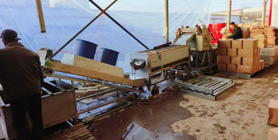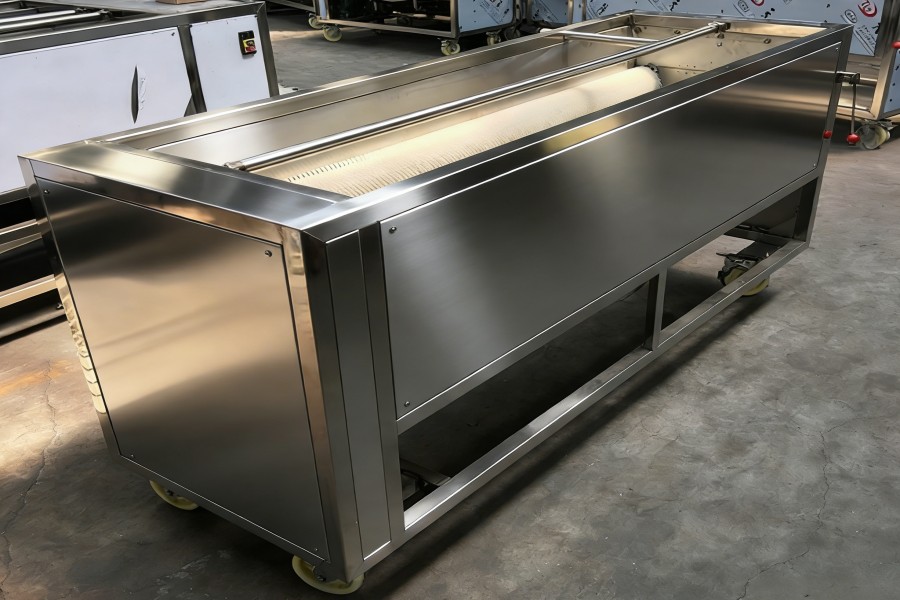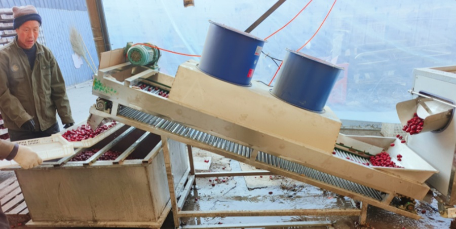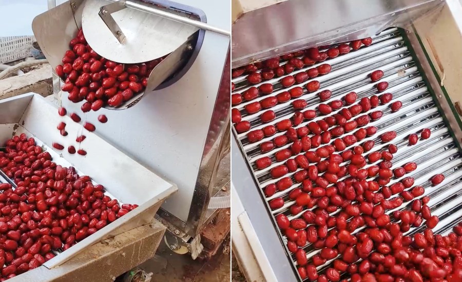 Brush cleaning machine: The surface of the jujubes is thoroughly cleaned of impurities through brushing and high-pressure spraying by the brush fruit washing machine.