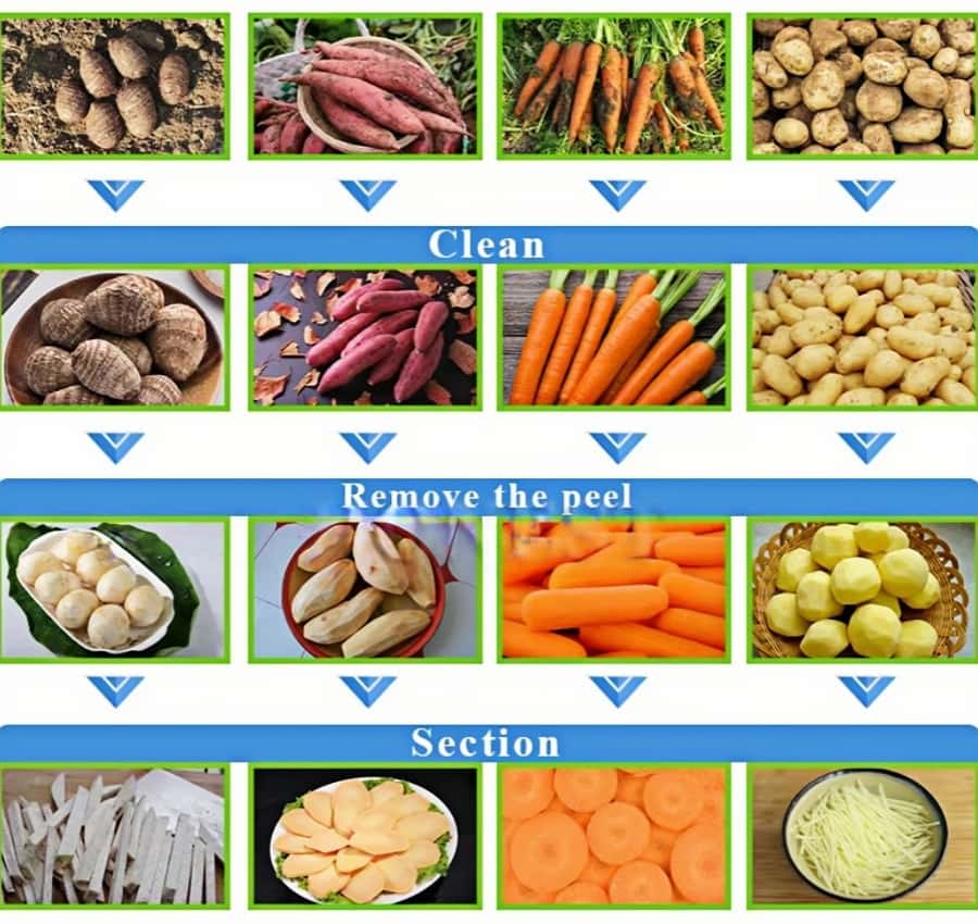 The machine is a multiple functional machine for washing, peeling, slicing, cutting into strips or shreds of fruits and vegetables such as potatoes, taro and kiwi fruit. It can peel or cut raw materials separately, also can peel and cut raw materials at the same time. The machine will clean and peel the raw materials first, then cut them into slices or strips. just need to change the blades. you can also adjust the thickness of the chips from 2mm to 10mm.One person can operate the equipment to save a lot of manpower and time. It is currently the most professional all-in-one equipment for washing, peeling, slicing, bar cutting fruits and vegetables in China. It is widely used in restaurants, canteens, vegetable processing and other industries.Applicable raw materials: Kiwi Fruit, and root vegetables such as potato, sweet potato, carrots, taro, beet etc.