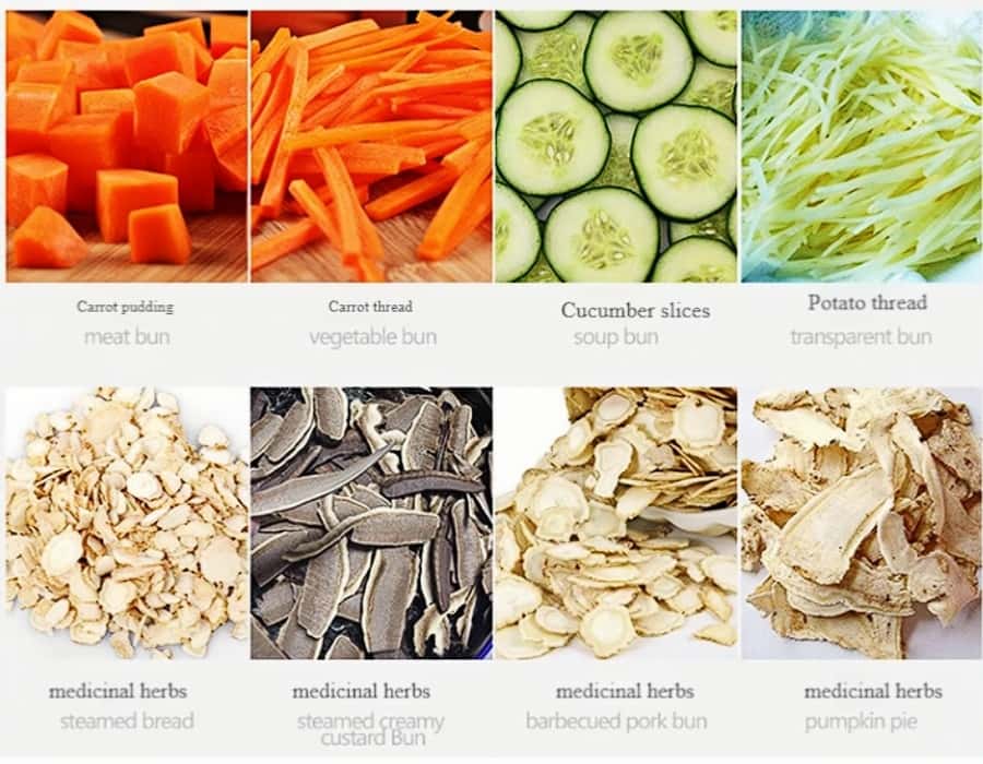 | Slice thickness can be adjusted | Dice size:6/8/10/15/20mm Slice size:2/3/4/5mm Shred size:2/2.5/3mm (Determine a size and it cannot be adjusted) Cutting segments:1-80mm (Adjustable) |